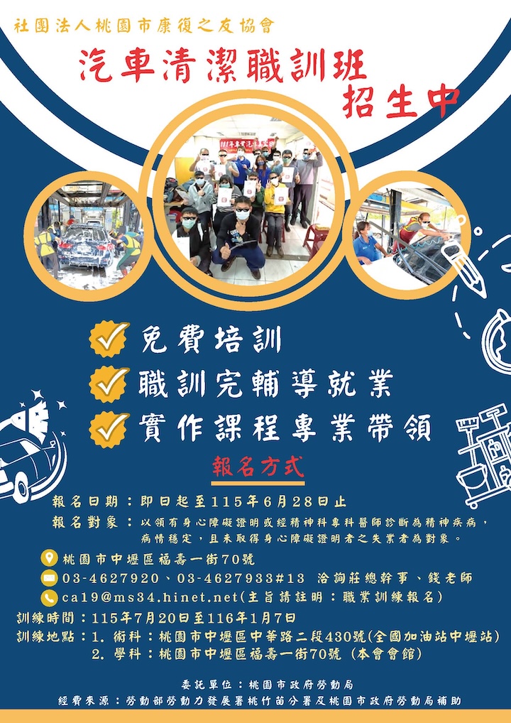 .版權所有:社團法人桃園市康復之友協會.瀏覽人數:591789 E-mail:ca19@ms34.hinet.net .本會地址:(32023)桃園市中壢區福壽一街70號一樓 .聯絡電話:03-462-7920,462-7933.傳真電話:03-462-7852 .IE7.0,Firefox.20以上版本.最佳螢幕解析度 1024x768 |隱私權宣告|資訊安全政策|